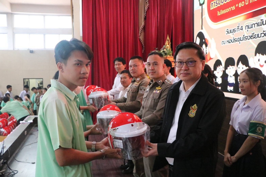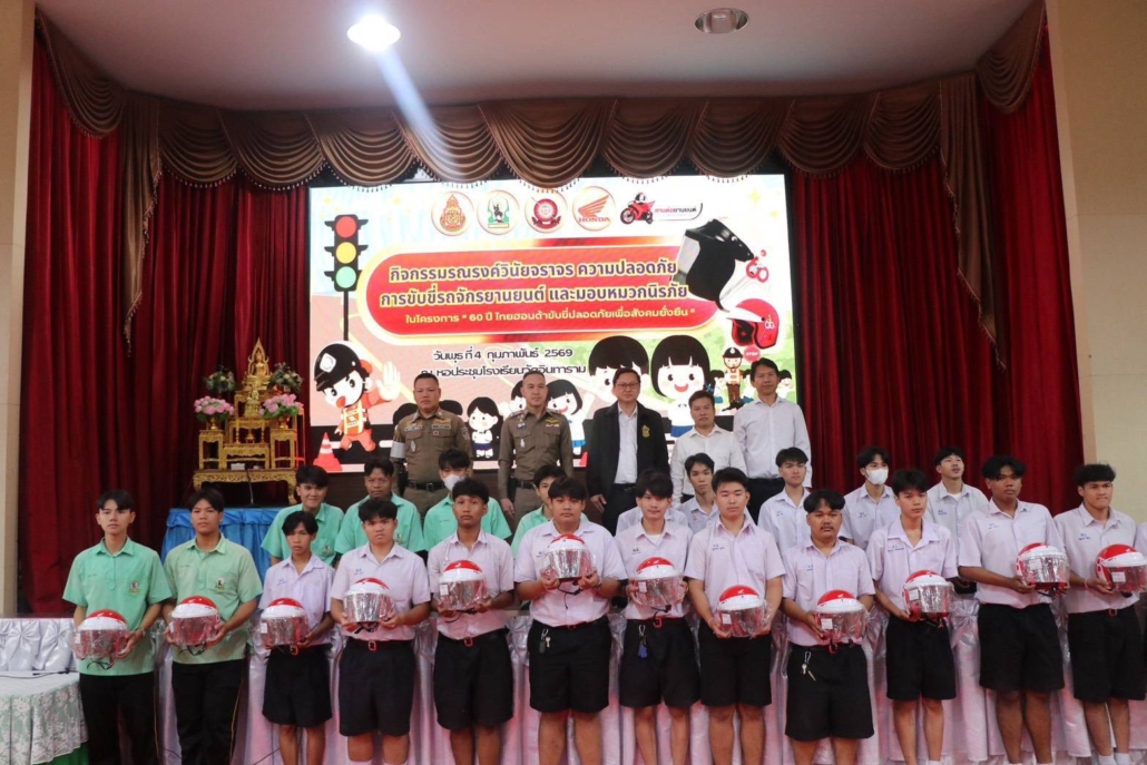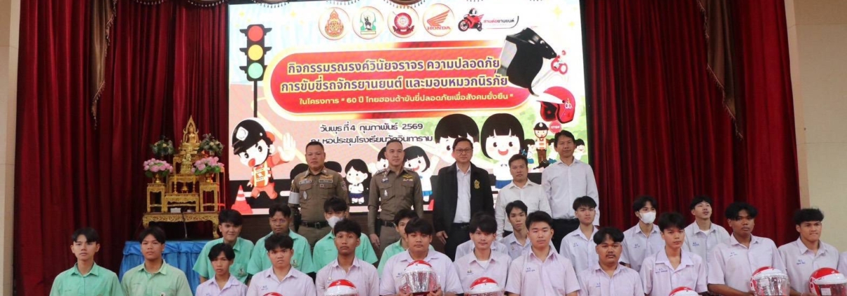 วันที่ 4 ก.พ. 2569 เวลา 08.30 น. จัดกิจกรรมรณรงค์ วินัยจราจร ความปลอดภัย การขับขี่รถจักรยานยนต์ และมอบหมวกนิรภัย ในโครงการ 60 ปีไทยฮอนด้าขับขี่ปลอดภัยเพื่อสังคมยั่งยืน