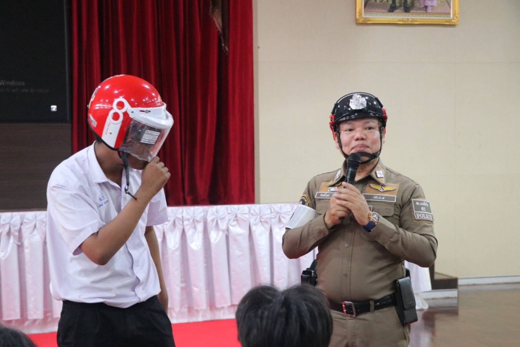 ร่วมกับ ผู้อำนวยการโรงเรียนวัดอินทาราม และคณะนักเรียน อบรมให้ความรู้แก่นักเรียน รร.วัดอินทาราม จัดกิจกรรมรณรงค์ วินัยจราจร ความปลอดภัย การขับขี่รถจักรยานยนต์ และมอบหมวกนิรภัย ในโครงการ 60 ปีไทยฮอนด้าขับขี่ปลอดภัยเพื่อสังคมยั่งยืน