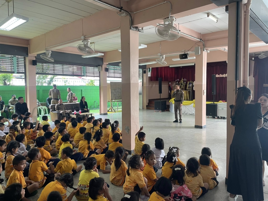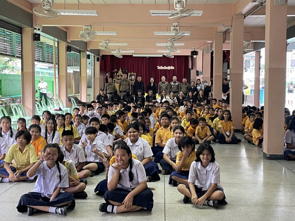 สน.บางยี่เรือ วันที่ 27 ก.พ. 2569 โครงการครู 5 นาที หน้าเสาธง เกี่ยวกับกฎหมายจราจร รณรงค์การขับขี่สวมหมวกกันน็อค และข้อห้ามเรื่องยาเสพติด บุหรี่ไฟฟ้า