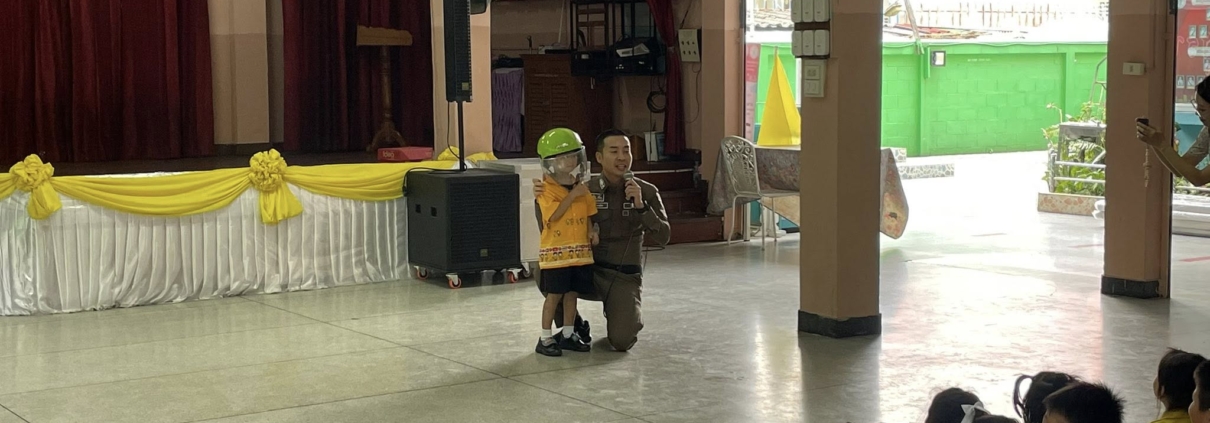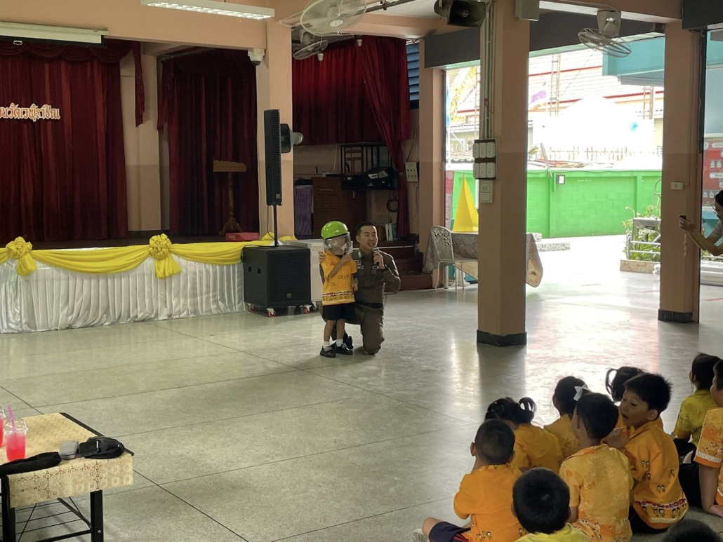 ได้อบรมให้ความรู้แก่นักเรียน รร.วัดเวฬุราชิน เกี่ยวกับกฎหมายจราจร รณรงค์การขับขี่สวมหมวกกันน็อค และข้อห้ามเรื่องยาเสพติด บุหรี่ไฟฟ้า ในโครงการครู 5 นาทีหน้าเสาธง